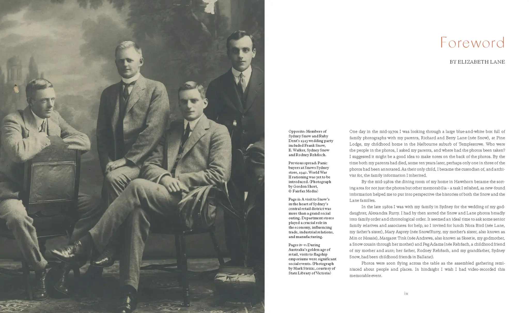 Sir Sydney’s youngest daughter, Elizabeth (Betty), married Richard Lane, one of the three brothers who founded the publishing house Penguin Books, thus entwining two families with a significant place in Australian cultural history. The story of Snow’s is evocatively told here by Sir Sydney’s granddaughter Elizabeth Lane and historian Stuart Kells in collaboration with Elizabeth’s daughter Louise Lane and art historian Fiona Kells. Lavishly illustrated with photographs from family and public archives, this beautifully designed publication is a proud tribute to the golden age of Australian department stores.