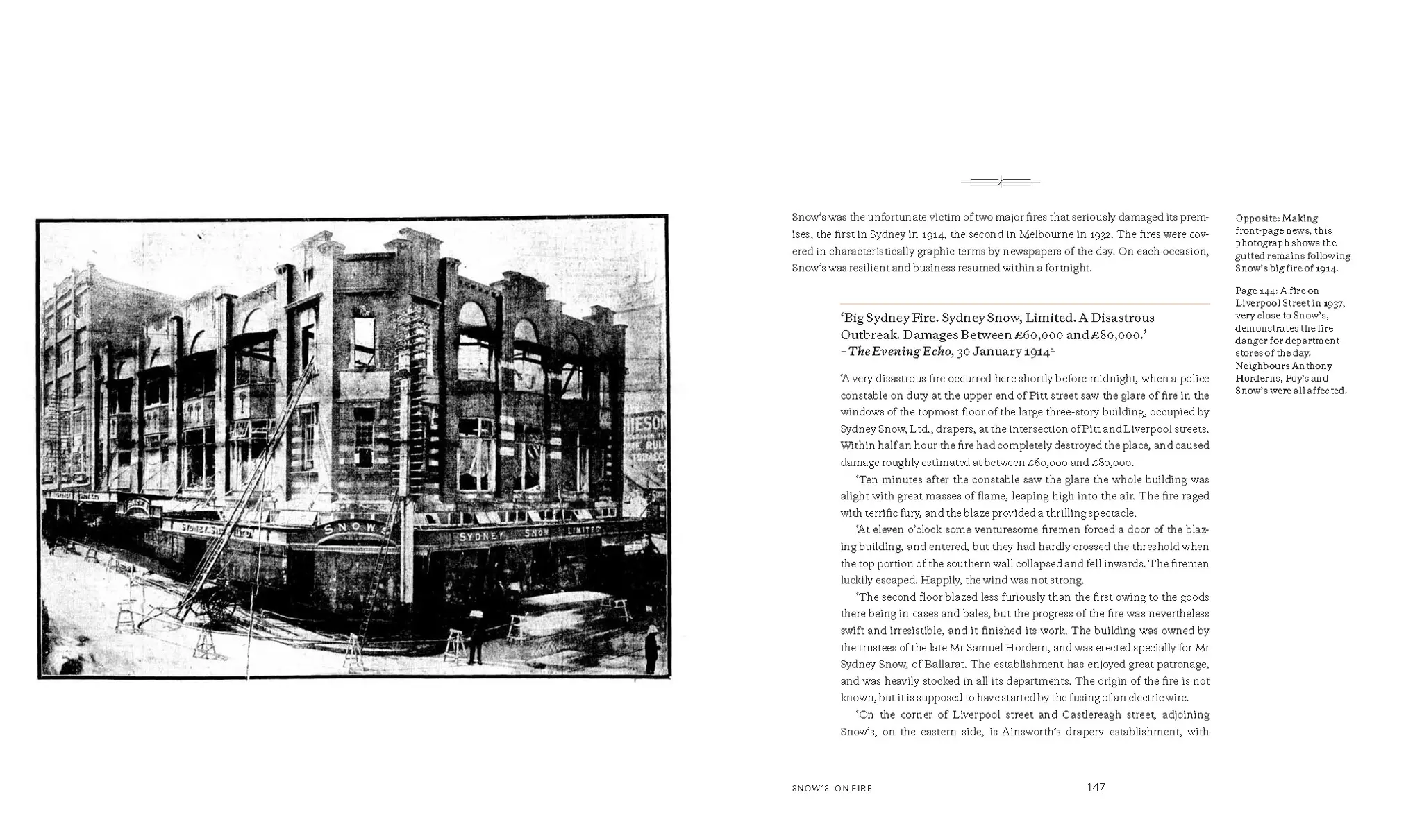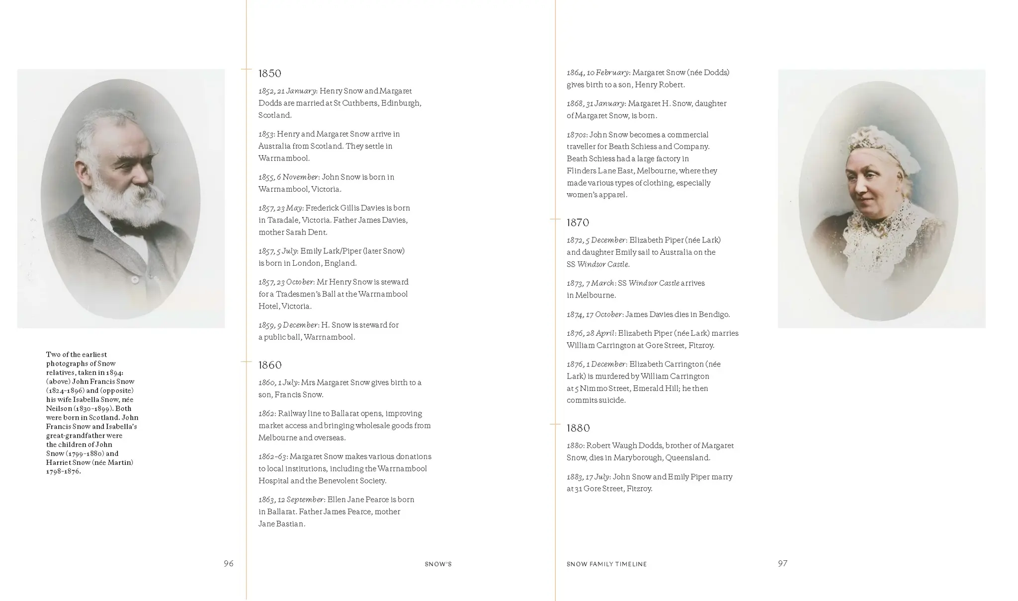 As is often the case with family history, it sits locked in memories, old photograph albums and, where we are lucky, objects passed down over time. I am grateful to Margaret Snow, a relative in Edinburgh, for writing a detailed history in 1988 of the Snow family and their origins. I received a copy of this in the 1990s from my aunt, and the transcripts of correspondence, family trees and Census records have made this journey so much easier. Perhaps looking into Emily Lark, Sydney Snow’s mother, was a catalyst for this book. Wanting to tell the stories – the poetic and mundane, the culturally significant and heartbreaking, the lives and laughter of those who came before me – was my driving force. I learnt from my cousin, Syd Jones, that Emily had been born illegitimate, to Elizabeth Lark. In 1876, it was a 19-year-old Emily who had to identify the body of her mother, who had been murdered by her second husband, and give testimony at the inquest into her death. Elizabeth was an early victim of domestic violence. Proving to be a woman of extraordinary character, Emily overcame these adversities to marry my great-grandfather John Snow. It was from this foundation that Snow’s was formed. So to all who discover this book, we hope these stories of resilience, family, and the foundation that built Snow’s inspire you to preserve and celebrate your own family history.